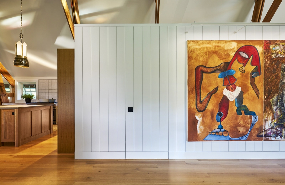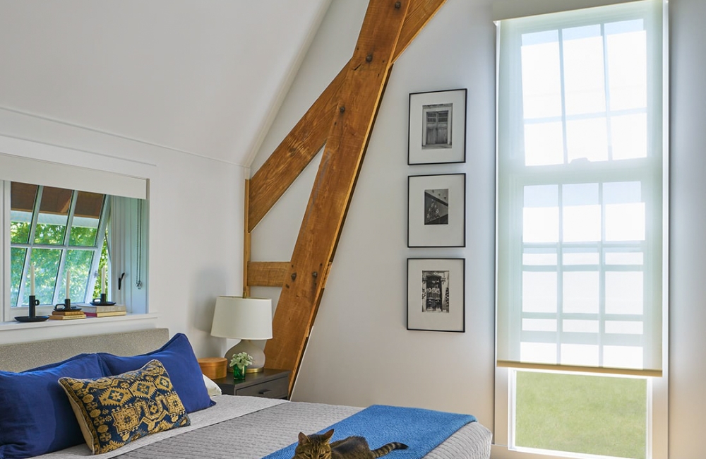 At the center, a long, wood-clad structure was added that houses multiple functional needs, including a pantry, powder room, primary bath, and clothes closets that double as a privacy screen for the main floor bedroom. Restrained finishes give the existing timber trusses their due respect and become a simple frame for the views of the changing seasons outside.