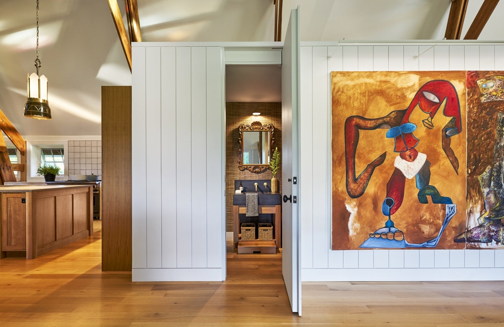 Special attention was given to the kitchen, which needed to function efficiently for its two owners but expand graciously when the full fleet of cooks and bakers arrive for larger family visits. A tight work triangle occupies the kitchen corner closest to the nearby living area. For state occasions, the kitchen nearly triples its functional size with an additional island and clean-up station, ready for big family dinners. An existing rustic shelf accommodates a caterers-sized collection of dinnerware. A new sideboard near the main work island holds the smaller tabletop needed for everyday dinners for smaller groups.